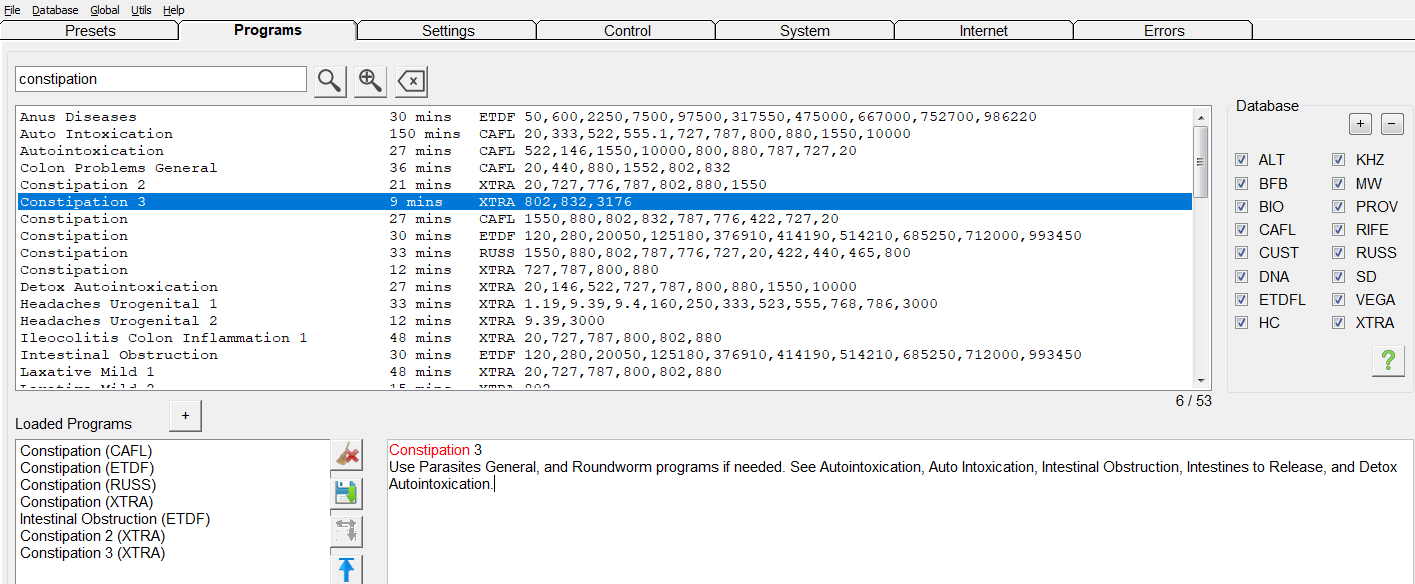 Wechseln Sie zur Registerkarte „Presets“ und wählen Sie „Shell (Empty) Presets“ > „Remote“ > „Healing (R) – JW“. Gehen Sie dann zur Registerkarte Programs, suchen Sie nach den Schlüsselwörtern „constipation (Verstopfung)“, um verwandte Programme zu finden, und doppelklicken Sie auf die gewünschten Programme. Übrigens sind nicht nur spezielle Verstopfungsprogramme sehr effektiv, sondern „Intestinal Obstruction“ ist auch sehr beliebt bei Spooky2-Kunden, die an Verstopfung leiden.
