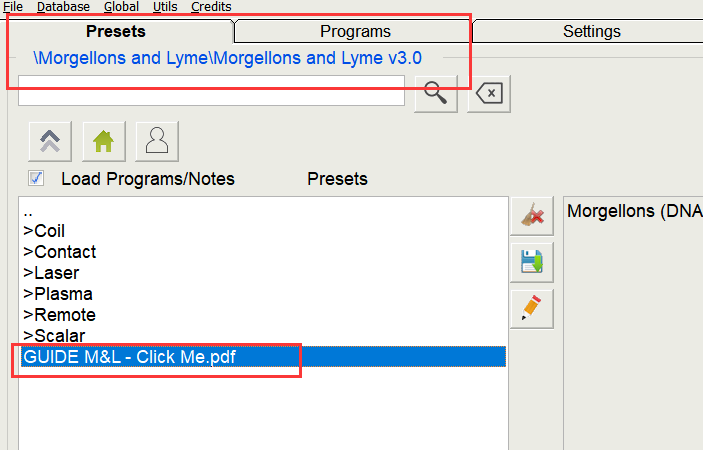 Klicken Sie auf die Registerkarte „Preset“->“Morgellons and Lymes“->“Morgellons and Lymes v3.0″->“GUIDE M&L – Click Me. PDF“