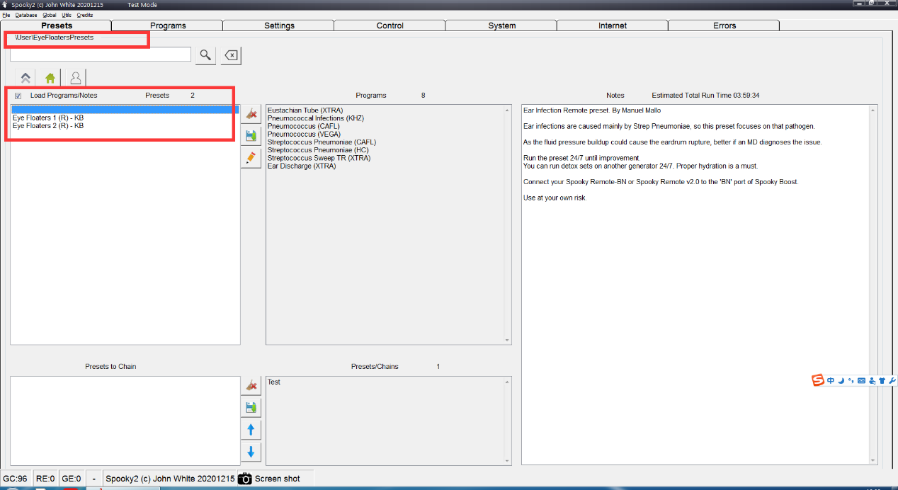 Laden Sie die Preset-Dateien herunter und kopieren Sie sie in den Benutzerordner (C: Spooky2-Preset Collections-User)