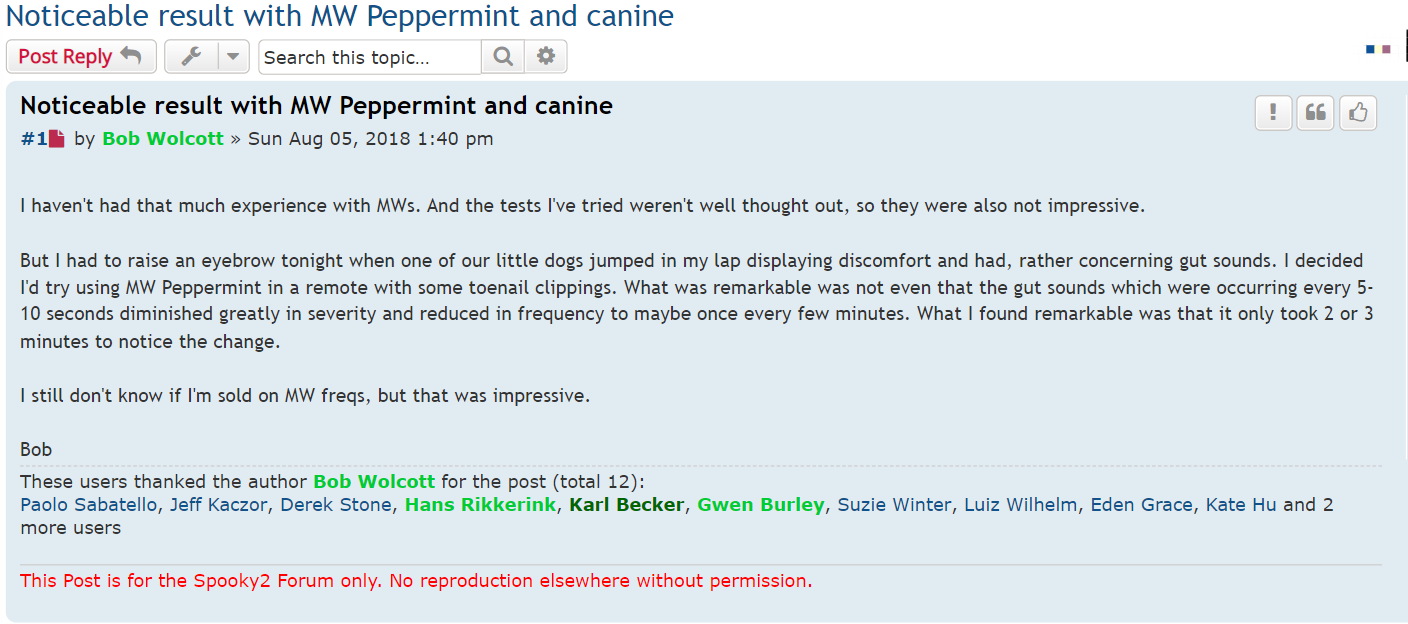 Aber ich musste heute Abend eine Augenbraue hochziehen, als einer unserer kleinen Hunde auf meinen Schoß sprang und Unbehagen zeigte und ziemlich beunruhigende Darmgeräusche von sich gab. Ich beschloss, es mit MW Peppermint in einer Fernbedienung mit einigen Zehennagelabschnitten zu versuchen. Was bemerkenswert war, war nicht einmal, dass die Darmgeräusche, die alle 5-10 Sekunden auftraten, in ihrer Schwere stark abnahmen und in ihrer Häufigkeit auf vielleicht einmal alle paar Minuten zurückgingen. Was ich bemerkenswert fand, war, dass es nur 2 oder 3 Minuten dauerte, bis ich die Veränderung bemerkte.