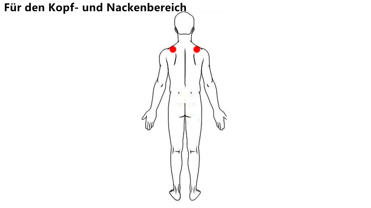 4. Beim Kopf- und Nackenbereich sollten Sie die TENS-Pads nicht direkt auflegen, da sich dort Ihre beiden wichtigsten Organe befinden: die Schilddrüse und das Gehirn. Plazieren Sie die Pads an der Rückseite beider Schultern.