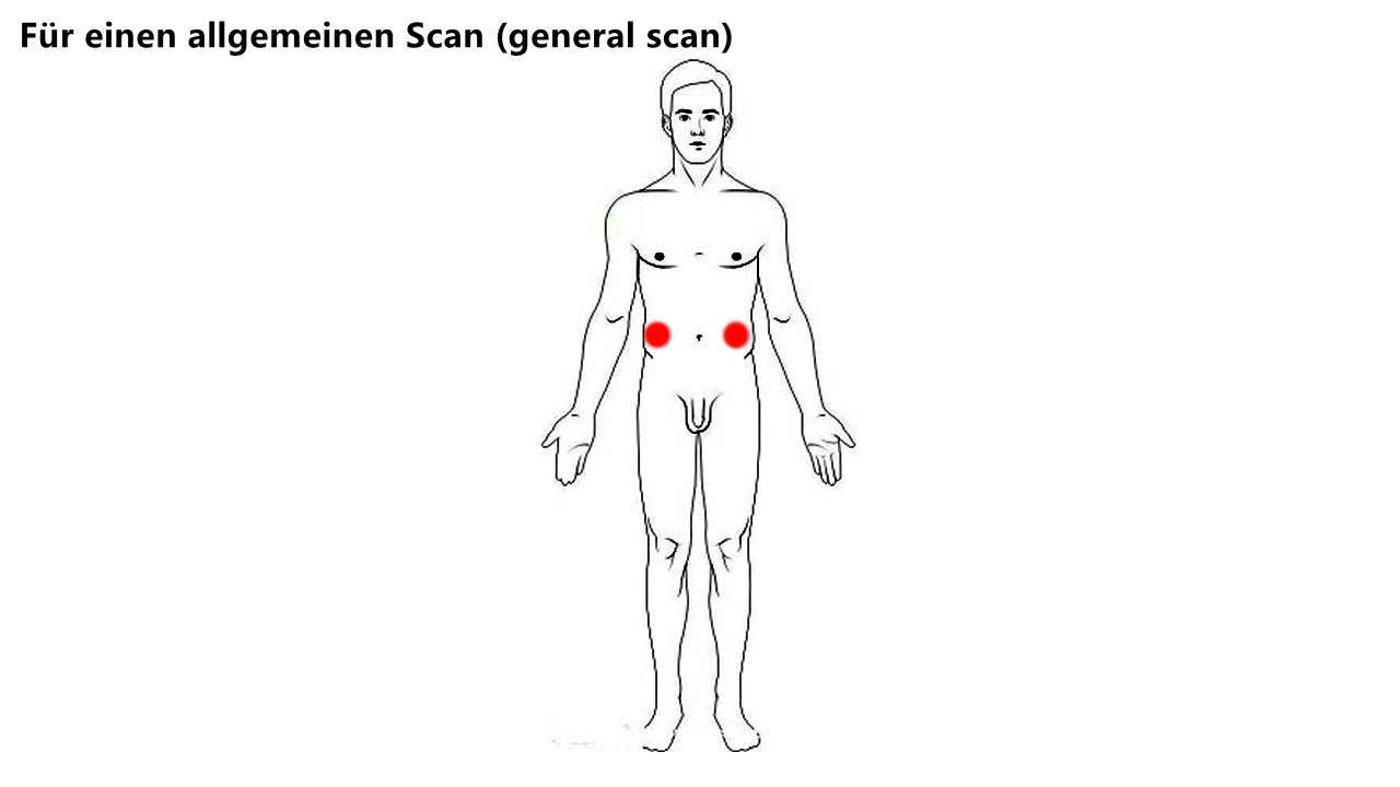 3. Für einen allgemeinen Scan (general scan), legen Sie die Pads auf der linken und rechten Seite des Rumpfes, in der Mitte zwischen den Hüften und den Schultern. Das Signal geht durch den Darm, der ein wichtiges Organ ist und den Zustand Ihres Körpers widerspiegelt. Dort befinden sich viele Krankheitserreger.