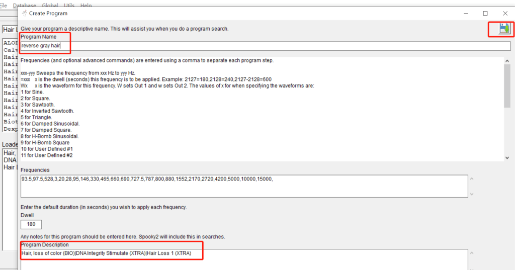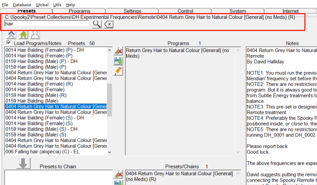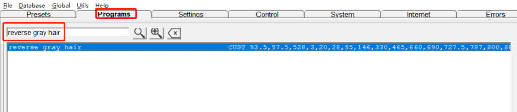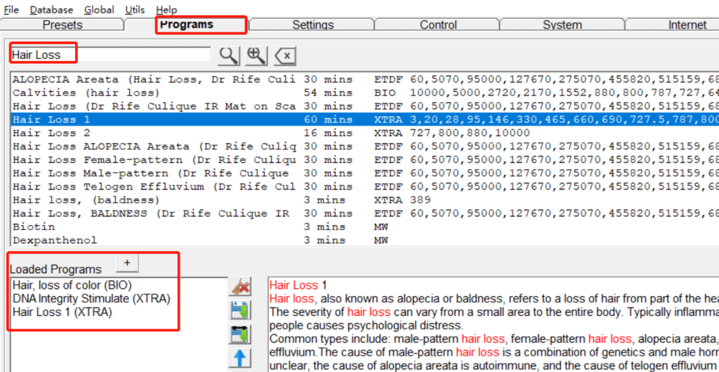 Gehen Sie zur Registerkarte „Programs“. Suchen Sie nach den von unseren Nutzern empfohlenen Programmen (wie “hair, loss of color”, DNA Integrity Stimulate,und Hair Loss) ) und doppelklicken Sie darauf, um sie zu laden.