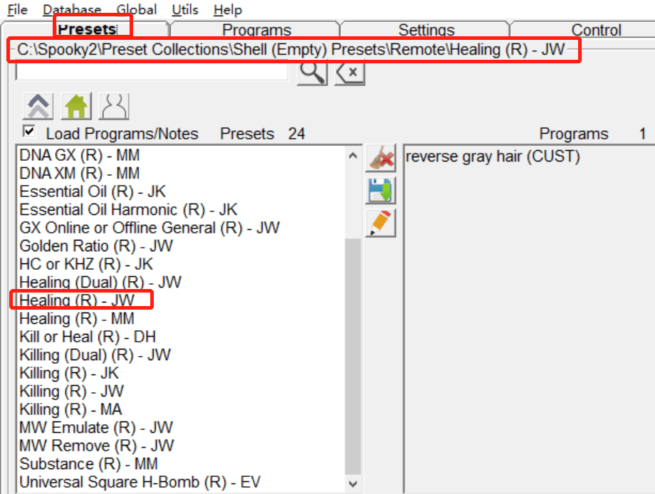 Öffnen Sie Ihre Spooky2-Software. Wählen Sie „Shell (Empty) Presets > Remote > Healing (R) – JW“.
