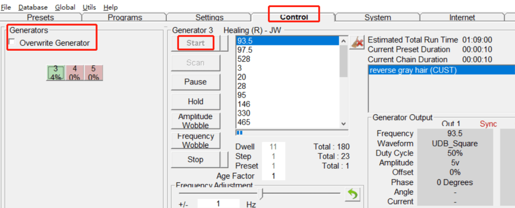 Gehen Sie zur Registerkarte „Control“, aktivieren Sie „Overwrite Generator“, wählen Sie Ihren Generatorport und klicken Sie auf die Schaltfläche „Start“, um es auszuführen.