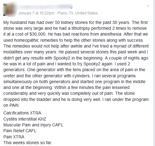 Mein Mann hatte in den letzten 30 Jahren über 50 Nierensteine. Der erste Stein war sehr groß und er ließ ihn zweimal durch eine Lithotripsie entfernen, was 30.000 Dollar kostete. Er hat schlechte Reaktionen von der Anästhesie. Danach haben wir homöopathische Mittel verwendet, um den anderen Steinen zum Erfolg zu verhelfen. Die Mittel halfen nach einer Weile nicht mehr und ich habe über viele Jahre hinweg unzählige verschiedene Modalitäten ausprobiert. Er hat in der vergangenen Woche mehrere Steine abgelegt und ich habe mit Spooky2 am Anfang keine Ergebnisse erzielt. Vor ein paar Nächten hatte er starke Schmerzen und ich wollte Spooky2 noch einmal ausprobieren. Ich habe auf beiden Generatoren mehrere Programme gleichzeitig laufen lassen und ein Programm in der Mitte und eines am Anfang gestartet. Innerhalb weniger Minuten ließ der Schmerz deutlich nach und war sehr schnell völlig schmerzfrei. Der Stein ist in die Blase gefallen und es geht ihm sehr gut.