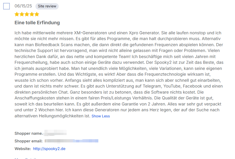 Ich habe mittlerweile mehrere XM-Generatoren und einen Xpro Generator. Sie alle laufen nonstop und ich möchte sie nicht mehr missen. Es gibt für alles Programme, die man halt durchprobieren muss. Alternativ kann man Biofeedback Scans machen, die dann direkt die gefundenen Frequenzen abspielen können. Der technische Support ist hervorragend, man wird nicht alleine gelassen mit Fragen oder Problemen. Vielen herzlichen Dank dafür, an das nette und kompetente Team! Ich beschäftige mich seit vielen Jahren mit Frequenzheilung, habe auch schon einige Geräte dazu verwendet. Der Spooky2 ist zur Zeit das Beste, das ich jemals ausprobiert habe. Man hat unendlich viele Möglichkeiten, viele Variationen, kann seine eigenen Programme erstellen. Und das Wichtigste, es wirkt! Aber dass die Frequenztechnologie wirksam ist, wusste ich schon vorher. Anfangs sieht alles kompliziert aus, man kann sich aber schnell gut einarbeiten, und dann ist nichts mehr schwer. Es gibt auch Unterstützung auf Telegram, YouTube, Facebook und einen direkten persönlichen Chat. Ganz besonders ist zu betonen, dass die Software nichts kostet. Die Anschaffungskosten stehen in einem fairen Preis/Leistungs Verhältnis. Die Qualität der Geräte ist gut, soweit ich das beurteilen kann. Es gibt außerdem eine Garantie von 2 Jahren. Alles war sehr gut verpackt und unter 2 Wochen hier. Ich kann diese Generatoren nur jedem ans Herz legen, der auf der Suche nach alternativen Heilungsmöglichkeiten ist.
