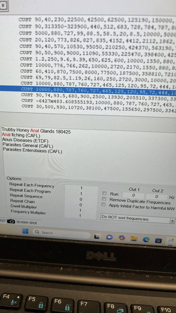 Ich habe das Preset „empty shell / remote / universal square h bomb“ verwendet und folgende Programme laufen lassen: Anal Itching (CAFL), Anus Diseases (ETDF), Parasites General (CAFL) und Parasites Enterobiasis (CAFL).