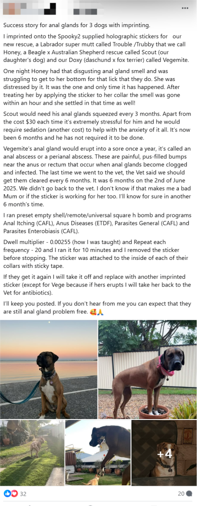 Eines Nachts hatte Honey diesen ekelhaften Analdrüsengeruch und hatte Schwierigkeiten, an ihr Hinterteil zu kommen, um daran zu lecken, wie sie es normalerweise tun. Sie war dadurch sehr unruhig. Es war das erste und einzige Mal, dass das passiert ist. Nachdem ich sie behandelt habe, indem ich den Aufkleber an ihrem Halsband angebracht habe, war der Geruch innerhalb einer Stunde verschwunden und sie hat sich in dieser Zeit auch beruhigt!