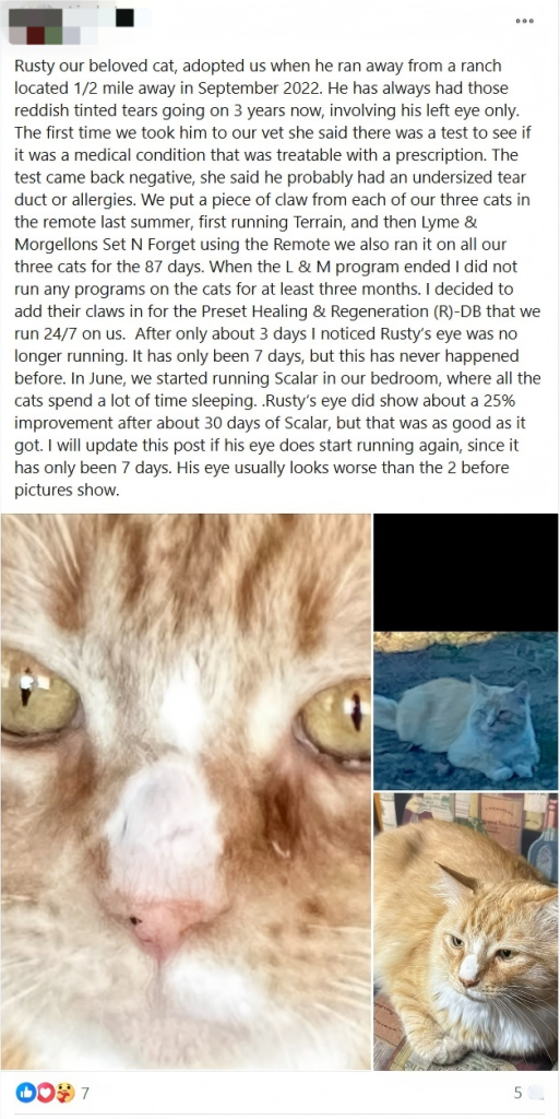 Im Juni hatten wir außerdem angefangen, das Scalar-Gerät in unserem Schlafzimmer laufen zu lassen, wo die Katzen gerne schlafen. Nach etwa 30 Tagen sah Rustys Auge zwar schon um etwa 25 % besser aus, aber danach stagnierte es.