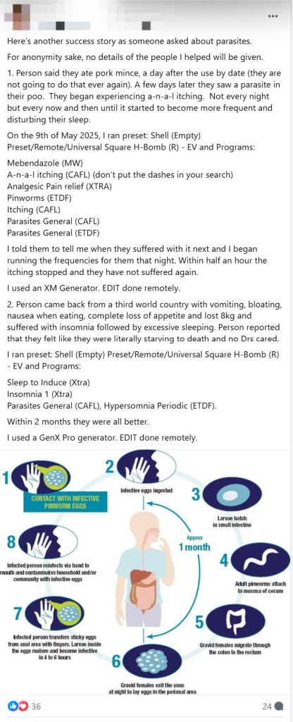 Ich bat sie, mir Bescheid zu geben, wenn die Beschwerden wieder auftreten, und begann noch am selben Abend, die Frequenzen für sie einzustellen. Innerhalb einer halben Stunde hörte der Juckreiz auf und sie hatten keine Beschwerden mehr.