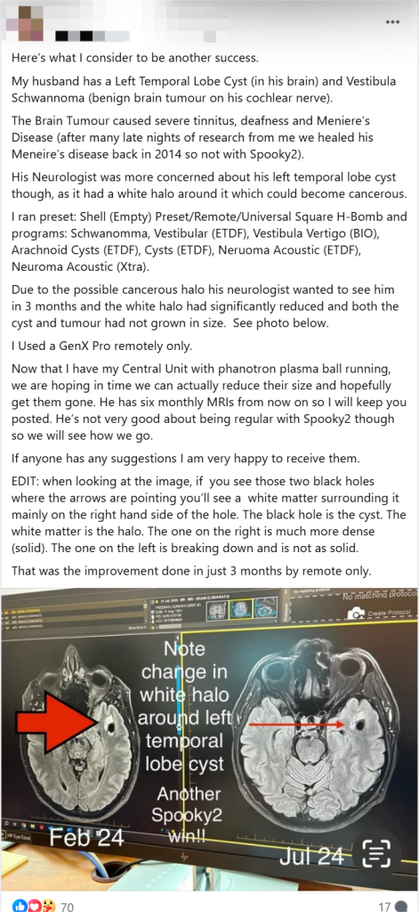 Inzwischen habe ich auch ein Central-Gerät mit Phanotron-Plasmakugel, das jetzt zusätzlich läuft. Unsere Hoffnung ist, dass wir mit der Zeit vielleicht sogar die Größe der Zyste und des Tumors verringern oder sie ganz loswerden. Ab jetzt bekommt er alle sechs Monate ein MRT – ich halte euch auf dem Laufenden.