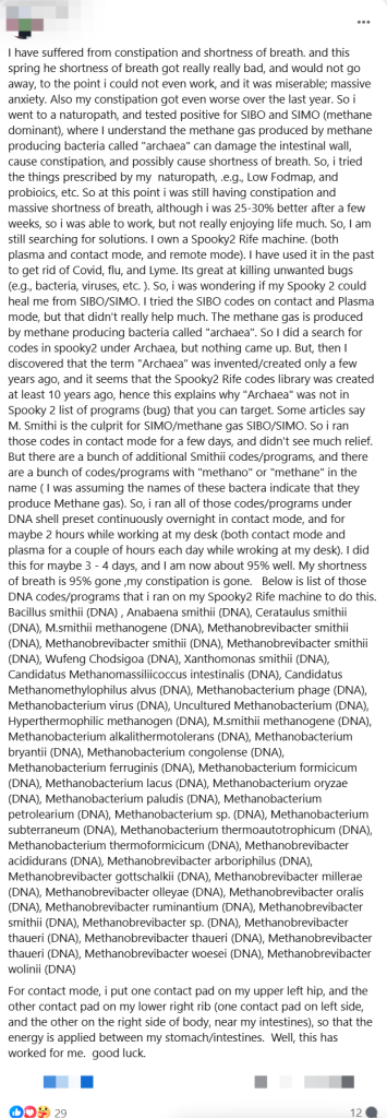 In einigen Artikeln heißt es, dass M. Smithii der Hauptverursacher von SIMO bzw. methanbasiertem SIBO/SIMO sei. Also habe ich diese Codes im Kontakt-Modus für ein paar Tage ausprobiert, aber keine große Erleichterung gespürt. Doch es gibt noch viele weitere Programme zu „Smithii“ und auch Programme mit „methano“ oder „methane“ im Namen (ich habe angenommen, dass diese Bakterien Methangas produzieren).