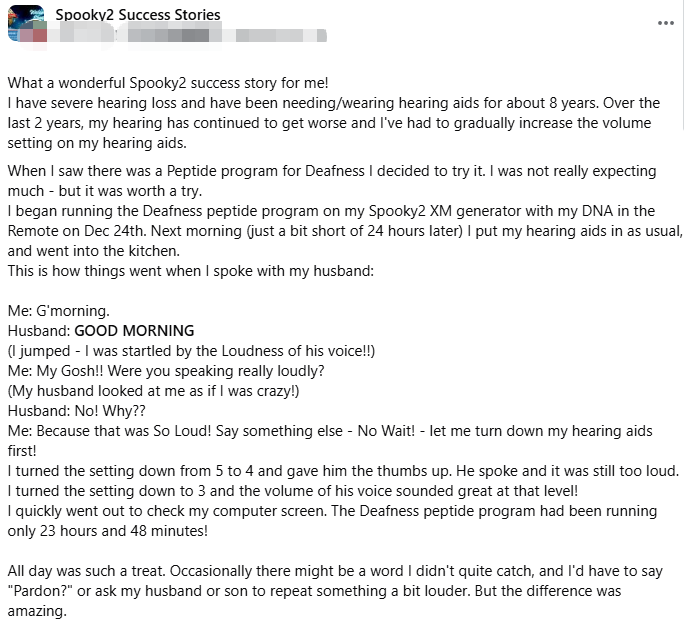 Am 24. Dezember begann ich, das Peptid-Programm „Deafness“ mit meinem Spooky2 XM Generator im Remote-Modus mit meiner DNA laufen zu lassen. Am nächsten Morgen – noch nicht ganz 24 Stunden später – setzte ich wie gewohnt meine Hörgeräte ein und ging in die Küche.