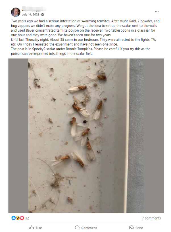 Vor zwei Jahren hatten wir einen ernsthaften Befall von schwirrenden Termiten. Nach viel Raid, 7-Puder und Insektenvernichtern haben wir keinen Fortschritt gemacht. Wir kamen auf die Idee, den Scalar neben den Wänden aufzustellen und Bayer konzentriertes Termitengift auf den Empfänger zu verwenden. Zwei Esslöffel in einem Glasbehälter für eine Stunde, und sie waren weg. Seitdem haben wir zwei Jahre lang keine mehr gesehen.