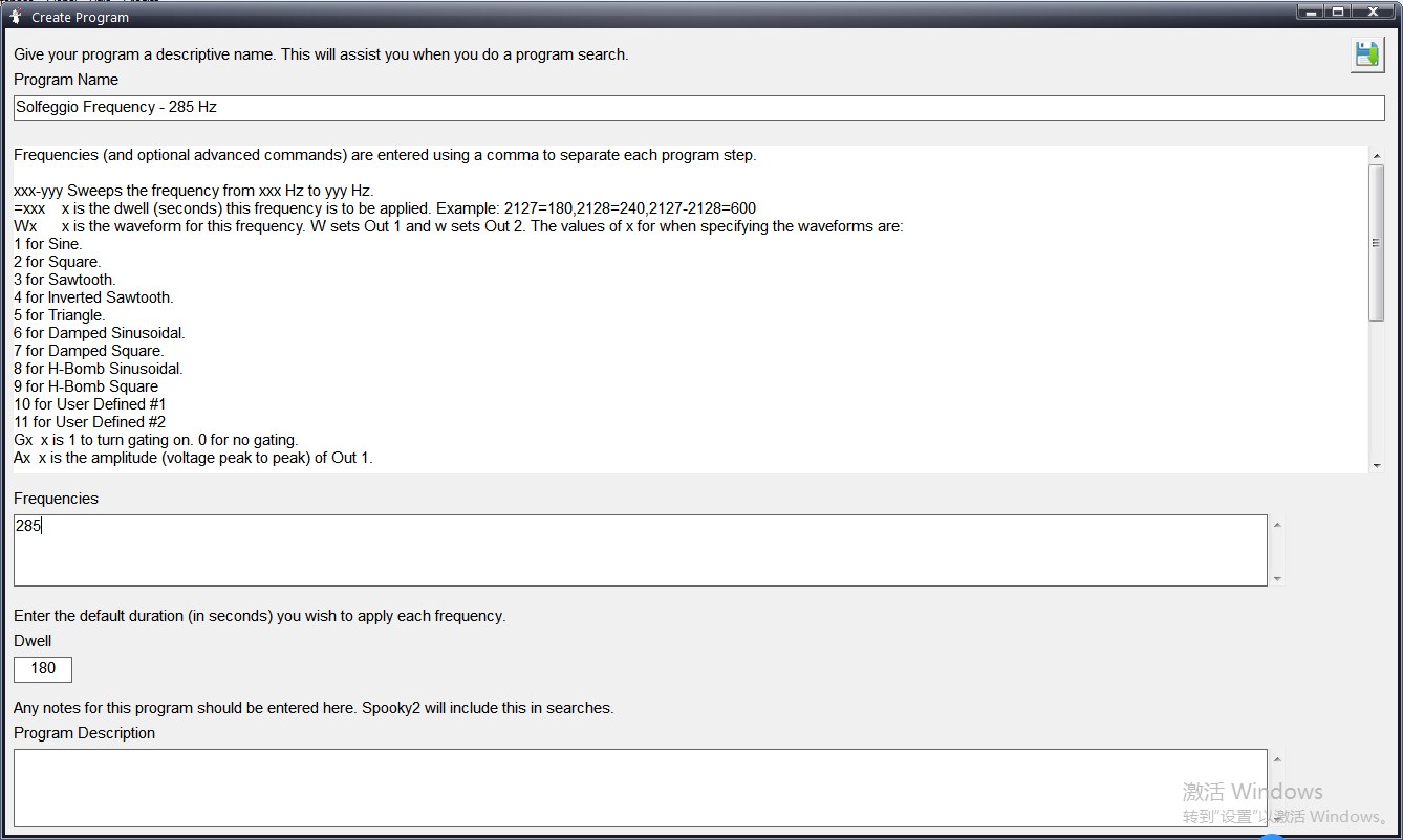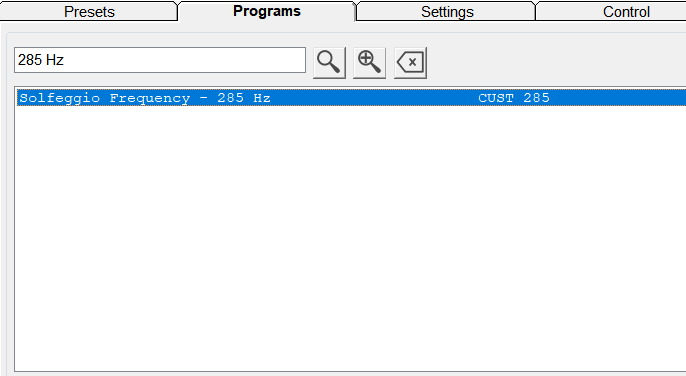 Wählen Sie unter den Voreinstellungen im Abschnit Shell (Empty) Presets\Scalar die Option Spooky Scalar General (SS)-JW und suchen Sie dann „285 Hz” im Abschnitt Programme. Doppelklicken Sie auf das markierte Programm.