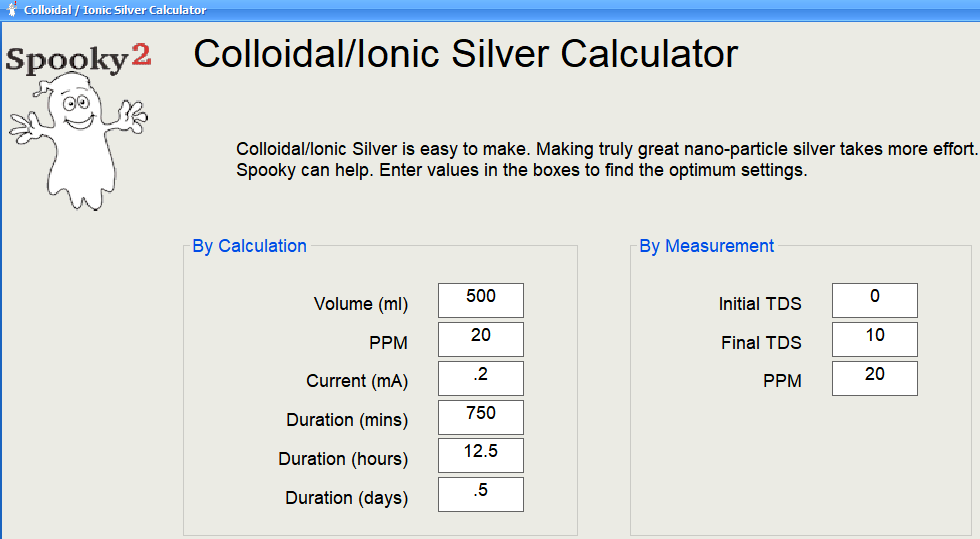 6.Colloidal / Ionic Silver Calculator (Calculator kolloidales Silber) öffnet ein Fenster, in welchem Sie mithilfe eines interaktiven Rechners die optimalen Zeitdauer für die kolloide Silberherstellung finden können.