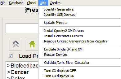 Das Utils-Menü beinhaltet verschiedene Dienstprogramme. Diese ermöglichen das Verwalten von Generatoren, USB-Schnittstellen und Gerätetreibern. Auch der Kalkulationsrechner bezüglich der Herstellung von kolloidalem Silber wurde hier eingruppiert.