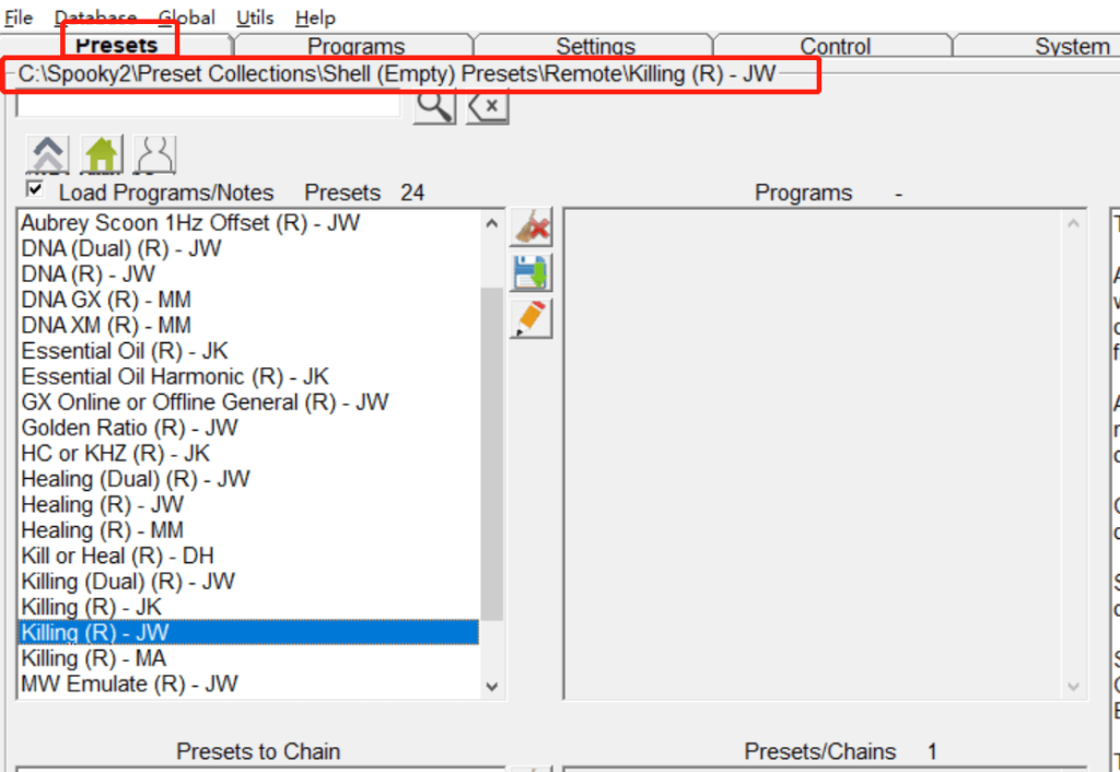 Schritt 1: Öffnen Sie Ihre Spooky2-Software und gehen Sie auf die Registerkarte „Presets“. Wählen Sie „Shell (Empty) Presets > Remote > Killing (R) – JW“.