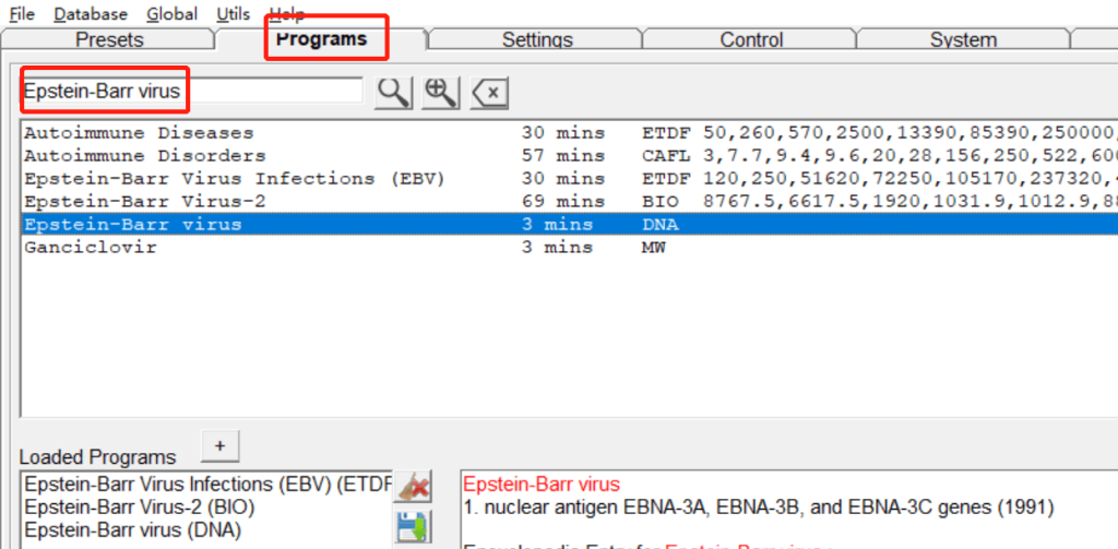 Schritt 2: Gehen Sie zur Registerkarte „Programs“, suchen Sie nach „Epstein Barr Virus“ und wählen Sie das/die gewünschte(n) Programm(e). Doppelklicken Sie auf die Programme, um sie zu laden.